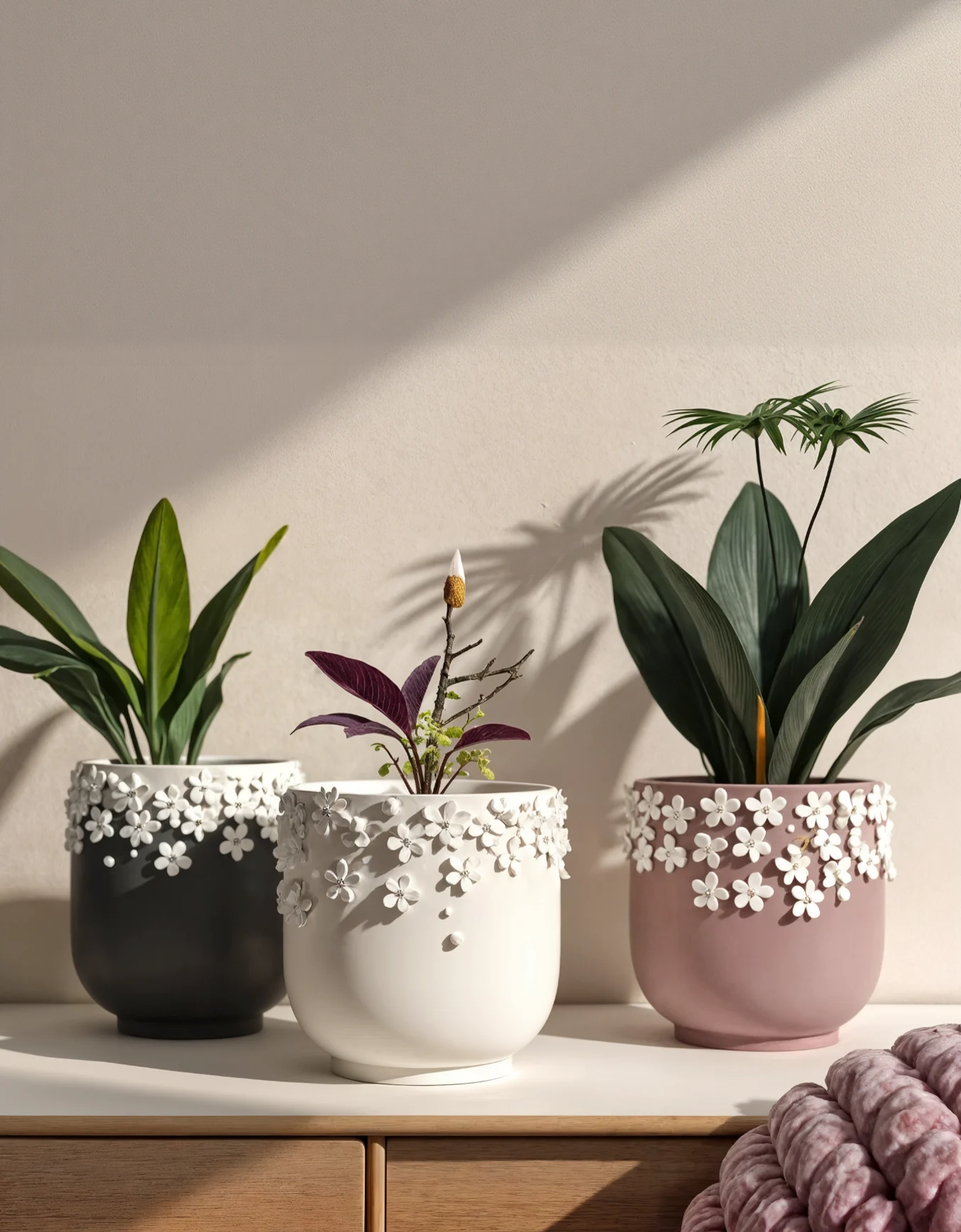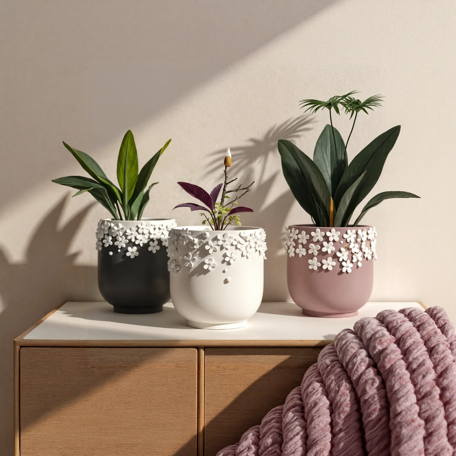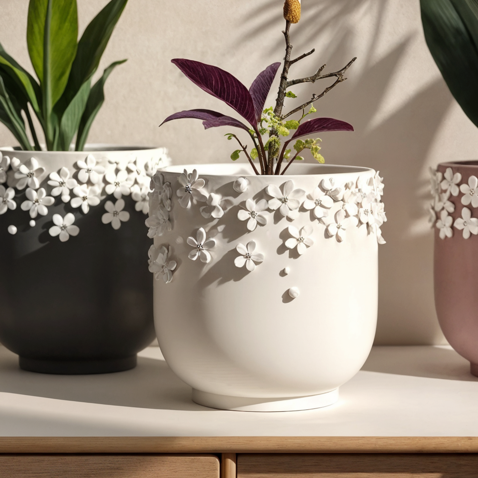 Call or WhatsApp: +91 9006469600Matte in moody charcoal, clean ivory, or dusty mauve, each one wrapped at the rim with delicate white blossoms that feel like your plant just stepped out of a festival lineup. Understated base, maximum texture—these pots make any corner look effortlessly curated. Perfect for your snake plant, tradescantia, or that purple oxalis you've been babying. Style them in a trio or let one steal the show.