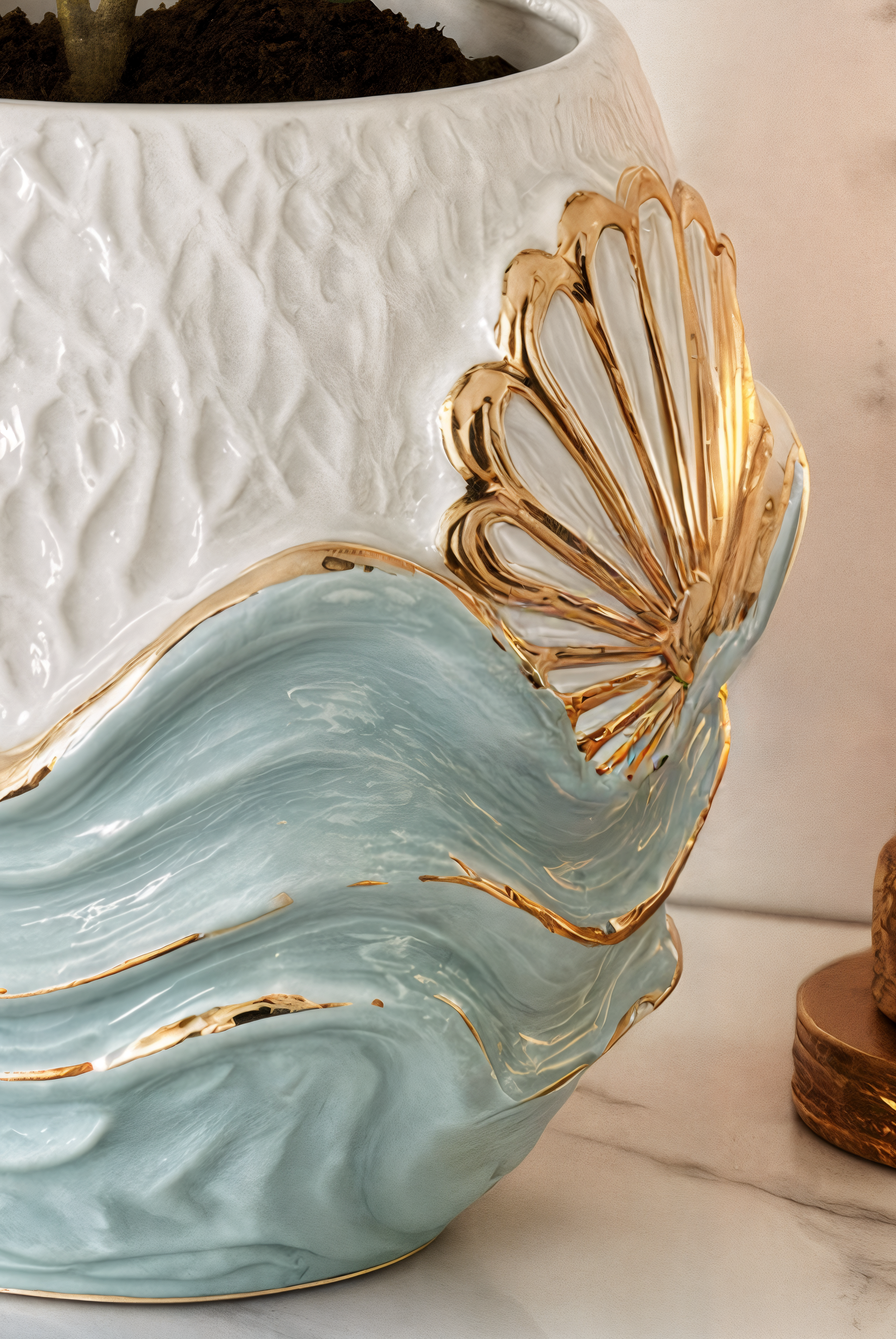 A subtle gold shell motif on the side — a nod to nature’s smallest treasures